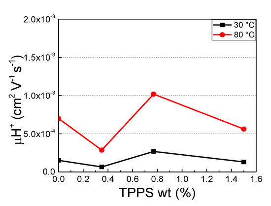 The ability of functional groups to retain water molecules is quantified by measuring the water uptake (Wup %) and calculating the λ parameter, as shown in Table 2. As expected, the Wup % increases by increasing temperature and, over the entire investigated temperature range, presenting a maximum value for the s-PEEK-0.77 membrane. Additionally, the λ parameter, in accordance with the Wup %, increases by increasing temperature and the amount of TPPS introduced. At 30 °C, the variation of λ follows the same trend as Wup %, and most of the water is present as loosely bound water (λ ≤ 10) [53]. At 80 °C, higher λ values are found. In particular, for the samples s-PEEK-0.77 and s-PEEK-1.5, values of 22 and 14, respectively, are obtained. This finding indicates that water is present as a second phase, which mainly contributes to the proton conduction mechanism. This effect could be correlated with the introduction of porphyrin into the membranes, thereby inducing a re-arrangement of the polymeric structure, as also revealed by SEM characterization. In fact, as reported in the Supplementary Material, Figure S1, different morphologies can be found, depending on the porphyrin loads. These results are in accordance with morphological and structural studies previously reported for similar systems [31]. Regarding the proton concentration, in this case, the data are also in agreement with the trend of water uptake and λ, presenting a maximum value for the membrane with porphyrin in J-aggregate form (s-PEEK-0.77). The proton mobility expresses the ability of the proton carriers to move into hydrated polymeric channels, and it is strictly related to the proton conductivity mechanism. From Figure 4, it is evident that the proton mobility is higher for the membrane with 0.77 wt % TPPS, than the other composite and recast membranes for both the investigated temperatures. In addition, the same trend reported for proton concentration, meaning that all the protons present in the second hydration phase (λ > 10) are involved in the conduction mechanism.