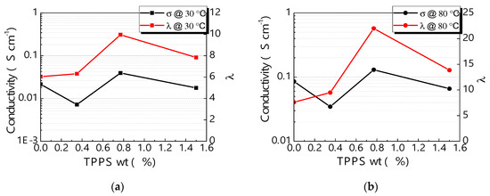 Another fundamental property of polymeric membranes is the proton conductivity, closely related to the chemical-physical parameters above discussed. The proton conductivity data, as a function of TPPS loading at two different temperatures (30 °C and 80 °C) are reported in Figure 5a,b. In general, the conductivity increases by increasing the temperature from 30 to 80 °C for all the investigated samples. Moreover, for both the temperatures, a maximum in conductivity can be found for s-PEEK-0.77, in accordance with the other chemical-physical values, especially water uptake, proton concentration, mobility and λ. The data were compared to λ values to highlight the importance of the bonding among protons, water and functional groups. The same trend was found for conductivity and λ at both the temperatures, meaning that the ratio of water per sulfonic group plays a key role in the conduction mechanism.