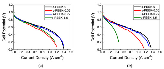 The electrochemical characterization in terms of I-V curves highlights the fact that s-PEEK-0.77 has the best performance among the investigated composite membranes, especially when operating in a more drastic conditions (i.e., 50% RH). A maximum power density value of 462 mW cm−2 for the s-PEEK-0.77 was obtained. This finding points to the active role of J-aggregates in the proton conduction channels, keeping the membrane hydrated and preventing the membrane from dry-out effect, even if a drastic reduction of the RH of the reactant gases occurs.