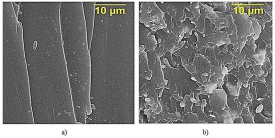 Figure 7a presents fractography of the destruction of epoxy composite samples without ocher, which is characterized by a rather smooth fracture surface, showing a low ability to crack resistance [31]. When ocher was added into the epoxy composition, they affect the morphology of the matrix—layered structures appear (Figure 7b).