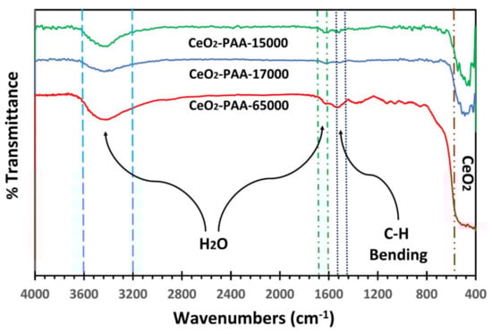 The FTIR spectra of the CeO2–NPs using PAA15000, PAA17000, and PAA65000 are illustrated in Figure 1. The presence of the cubic CeO2 was detected by the FTIR studies. Of the most characteristic bands, there was an intense peak at ~550 cm−1 corresponding to the phonon mode of the cubic CeO2. The strong absorption peak at 470 cm−1 exhibited the Ce-O stretching. In addition, the absorption bands were respectively found at 1620 and 3430 cm−1 representing the ν (OH) mode of (H-bonded) water molecules and δ (OH) [27]. No peak for the NO stretch was detected by the FTIR analysis, revealing that the washing procedure omitted the trace amount of nitrate. Furthermore, the absorption peaks in the range of 1400–1500 cm−1 corresponded to the bending vibrations of -CH groups [28].