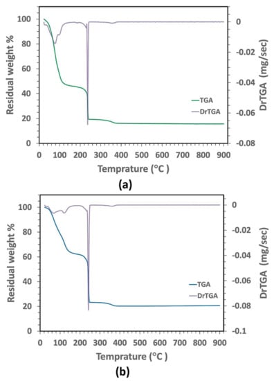 TGA/DrTGA curves of the as-prepared gels with (a) PAA15000 and (b) PAA17000.
