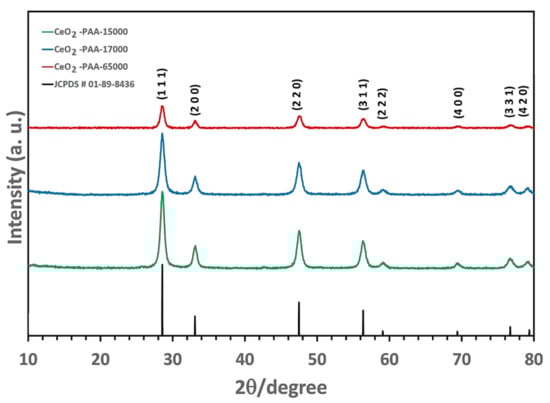The PXRD patterns of the CeO2-NPs are presented in Figure 3. All of the detectable peaks were indexed with Miller indices (hkil = 1 1 1, 2 0 0, 2 2 0, 3 1 1, 2 2 2, 4 0 0, 3 3 1, and 4 2 0), which were consistent with the cubic fluorite-type structure of CeO2 (JCPDS # 01-089-8436); this structure had a main orientation of the (1 1 1) reflection plane. The PXRD data confirmed the high quality of the CeO2–NPs [no peak indicative of possible intermediate phases, including Ce(OH)4/Ce(OH)3]. Moreover, it was found that the PXRD peaks became less sharp, and FWHM decreased after calcination at 400 °C for 2 h, suggesting that the crystallinity of the CeO2–NPs was deteriorated as the PAA molecular weight increased.