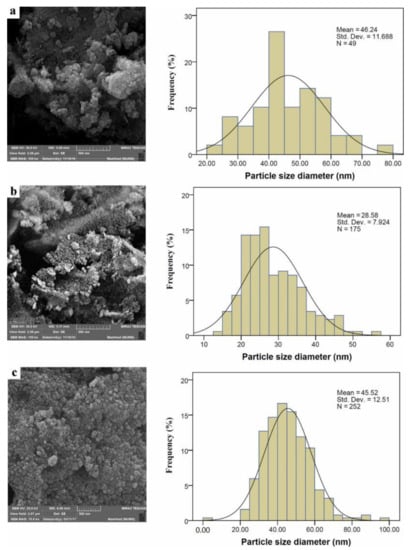 The FESEM image and size distribution of the CeO2–NPs are demonstrated in Figure 4 at various magnifications. As can be seen, the synthesized CeO2–NPs had the form of spherical aggregations. These particles were small in size, with an average size of 46.24, 28.58, and 45.52 nm (less than 50 nm [22]) when PAA15000, PAA17000, and PAA65000 were used, respectively. These findings were in line with the PXRD data and could explain the broadening of the peaks. According to the FESEM images, the nano-sized particles were uniform in morphology, and the use of PAA-65000 led to the NPs with a narrower size distribution.