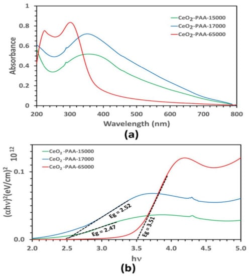 where B is a constant, hν is the photon energy, α is the absorption coefficient, n is 2 for the direct transitions, and Eg (i.e., band gap energy) is the spot of the junction of the Tau plot slope on the x-axis [32,33]. According to Figure 5b, the calculated band gap energies for the CeO2-NPs prepared by PAA15000 and PAA17000 were 2.47 and 2.52 eV, respectively. These samples showed a strong red shift in the band gap as compared with the bulk cerium oxide (Eg = 3.19 eV) [34]. On the other hand, the samples with PAA65000 had a band gap energy of 3.51 eV, greater than that of the bulk CeO2, and indicative of the blue shift in the band gap as a result of quantum confinement [35]. A decrease in the PAA molecular weight from 65,000 g/mol to 15,000 g/mol was obviously associated with a red shift in λmax, which could be due to agglomeration and wide particle size distribution. This observation can be explained partly by the fact that typical direct semiconductors indicate a blue shift in λmax if their particle sizes reduce [33,36]. λmax and crystallite size are summarized in Table 1.