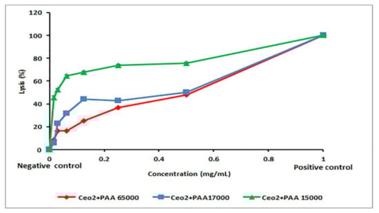 In the human body, the erythrocytes exist in great quantities and possess large amounts of biological and morphological characteristics. Therefore, these cells have been vastly used in drug transport. The main target of the polyunsaturated fatty acids as well as hemoglobin molecules, known as redox-active oxygen transport molecules and potent promoters of activated oxygen species, is the erythrocytes. Oxidative damage to their membrane lipids and proteins can account for hemolysis that further causes several complications, such as oxidative drugs and excess of transition metals [37]. Moreover, hemolysis is more likely to induce anemia in different medical conditions [38,39]. This experiment was applied to evaluate if synthesized nanoceria could mutilate the erythrocyte membrane, given some previous reports concerning the toxicity of the CeO2-NPs [40,41]. The results in Figure 6 indicated that the CeO2–NPs prepared by PAA had potent hemolytic actions in a dose-dependent manner. The lysis of erythrocytes was found to decrease significantly as the concentration of the NPs increased (p < 0.001). At an identical concentration, the CeO2–NPs with PAA15000 exhibited maximum hemolysis, whereas the CeO2–NPs with PAA65000 inhibited hemolytic activity to the greatest extent. The HC50 values are shown in Table 2. The highest HC50 was for the sample prepared with PAA65000 (7.35 ± 1.32 mg/mL). This finding implies that less damage occurred following the use of the CeO2-NPs with PAA65000, which may be attributed to their λmax < 299 nm and high amounts of Ce3+ on the surface. Besides, this in vitro test revealed the biocompatibility of the synthesis of nanoceria using PAA65000, which makes them promising for future drug development and biomedical applications, such as the treatment of cancer.