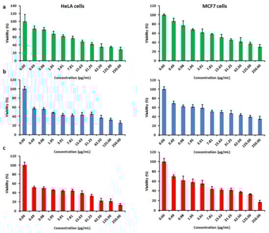 The cytotoxicity and half-maximal inhibitory concentration (IC50) of the NPs were evaluated by the MTT assay [22]. Briefly, HeLa and MCF7 cell lines were cultured in high glucose DMEM medium (1 g/L glucose, 2 mM glutamine) supplemented by 10% (v/v) FBS, 100 units/mL penicillin, and 100 μg/mL streptomycin. These cells were then incubated at 37 °C under damp air conditions (90% relative humidity) with 5% CO2. After three days, the non-adherent cells were segregated by replacing the medium with a fresh one, while the anchorage-dependent cancer cells were expanded further through two passages. Subsequently, the cells were harvested from culture flasks via treatment with trypsin (0.25%) and seeded overnight at a density of 1 × 104 cells per well in a 96-well plate. After that, the cells were exposed to the various concentrations (10 dilutions) of the NPs for 24 h. In the next step, 10 μL of 5 mg/mL MTT in the PBS buffer were added to each well and allowed for 4-h incubation at 37 °C. Following DMSO (100 μL) addition, optical absorbance was recorded at 540 and 630 nm (reference wavelength) using a plate reader (Stat FAX 2100, Awareness Technology, San Jose, CA, USA). All experiments were carried out five times [23,24].