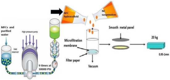 The hybrid suspensions with CNF/NCmixing ratios of 0/100, 4/96, 10,90,15/85, 20/80, 35/65 and 50/50 wt % were made. The resulting amber-colored mixtures were then filtered under vacuum over the paper filter paper to remove water and form CNF/NC mats. Each formed NC-CNF CNF/NC wet mat was carefully removed from the top of the filter paper and was placed between two polished stainless steel plates. The assembly was dried under weight at 70 °C for 24 h in a vacuum oven (LC-233B1, Espec Co., Hudsonville, MI, USA). The CNF/NC films with thicknesses of about 1 mm were obtained (Figure 1).