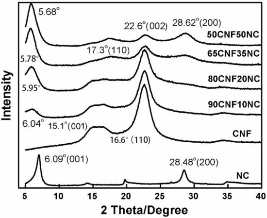 X-ray diffraction (XRD) patterns of pure NC and CNF as well as of the CNF/NC composites.