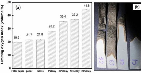 (a) Limiting oxygen index (LOI) of CNF/NC composites in comparison to printing and filter paper. (b) Photograph showing char formation for the composites containing (C1) 5%, (C2) 10%, (C3) 15%, and (C4) 20% of NC.
