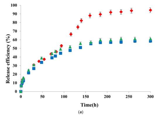 Curcumin (a) and 5-FU (b) release efficiency as a function of time at pH 2 (diamonds), pH 6.8 (squares), and pH 7.4 (triangles) and 37 °C.