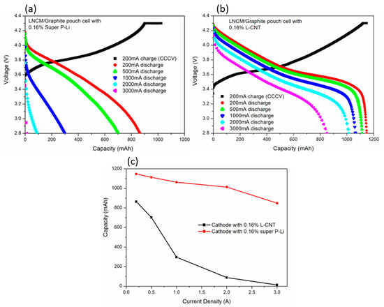 After the characterization of the structure and chemical composition, L-CNT-containing, LNCM electrode-based 1Ah LNCM/graphite full pouch cells were fabricated to investigate the electrochemical properties. Figure 5a,b display the 200 mA charging (lithium intercalation into negative graphite) curve and discharged (lithium de-intercalation) curves under various current densities of the cell, with 0.16% carbon black super P-Li, and a 0.16% L-CNT-containing cathode. At the current of 200 mA, the discharged capacity of the cell with super P-Li is not able to reach 1Ah, which is 864.1 mAh. The cell containing L-CNT has a higher capacity; 1147.7 mAh. In Table 1, by dividing the weight of the active material in LNCM, the unit capacity performances of the cathode materials are 170 and 129 mAh−1g, in L-CNT and super P-Li cell, respectively, revealing an insufficient amount of carbon black super P-Li in the role of the conductive carbon. Observing the 200 mA charging and 200 mA discharging in Figure 5a,b, the discharging voltage plateau is higher and the charging voltage plateau is lower in the L-CNT-containing cell than in super P-Li-containing cell, indicating a lower internal resistance and higher ionic conductivity in the L-CNT-containing cell than in the cell containing the same amount of super P-Li. Table 1 compares the details of the electrode and pouch cells, including formulation, cell volume, weight and energy density. While every pouch cell share a similar volume and weight, the L-CNT-containing cells with a higher capacity reach a greater energy density (Wh/kg and Wh/L). The energy density of the 0.16% L-CNT-containing cell is 223.6 Wh/kg or 549.3 Wh/L, about 35% higher than the cell containing 0.16% super P-Li. The energy density would increase more in larger capacity pouch cells. To know more fully the practical utility of the cells containing different formulations, the higher discharging current of these LNCM/graphite pouch cells is also evaluated. In Figure 5a, the capacity of cells containing 0.16% super P-Li decreases rapidly with the current density, and is almost zero at the current of 3000 mA. In contrast, the discharging capacity of L-CNT-containing cathode at 500mA is 164.86 mAh/g, and 1113.3 mAh for the pouch cell, as shown in Figure 5b and Table 1. The capacities of the L-CNT-containing cell are 1063.3, 1013.5 and 848.5 mAh at 1000, 2000 and 3000 mA discharging current, respectively. The corresponding values for the super P-Li-containing cell are 297, 89 and 14 mAh, as summarized in Figure 5c.