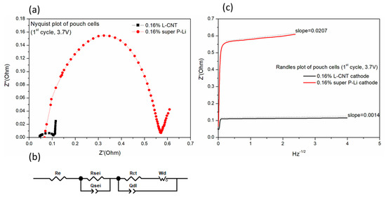 (a) Nyquist plots of LNCM/graphite pouch cell with LNCM/PVDF/L-CNT = 98.84/2/0.16 and LNCM/PVDF/super P-Li = 98.84/2/0.16 as cathode, (b) the equivalent circuit for describing AC impedance of the cells between 100kHz and 0.01Hz, and (c) the Randle plots of the cells at 50% SOC, first cycle.