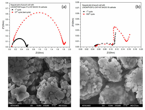 Nyquist plots of the (a) 0.16% carbon black super P-Li-containing cathode cell and (b) 0.16% L-CNT-containing cathode cell at the first and the last cycle. SEM images of the cathodes (c) LNCM/PVDF/Super P-Li = 97.84/2/0.16 after 1C, 37 cycles and (d) LNCM/PVDF/L-CNT = 97.84/2/0.16 after 1C, 500 cycles in LNCM/Graphite pouch LIBs.
