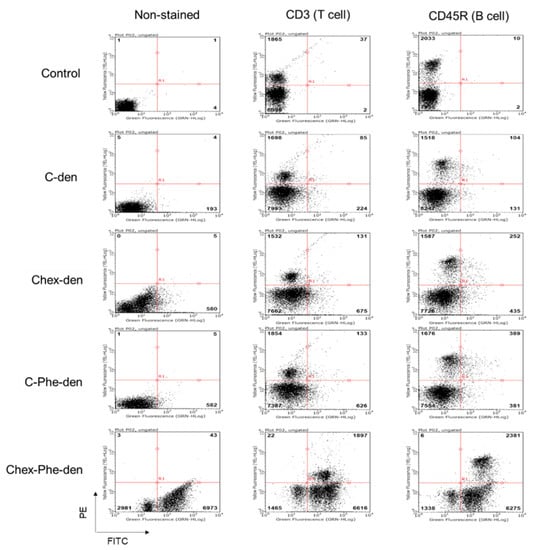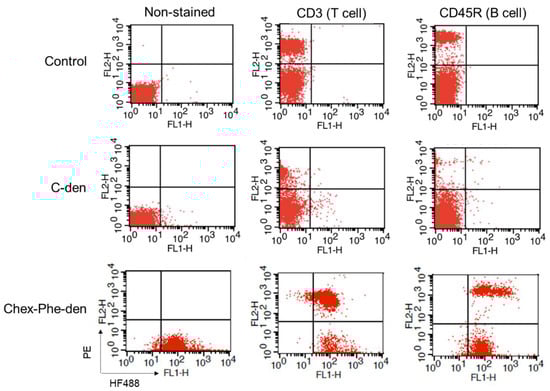 First, four types of carboxyl-terminal dendrimers with different hydrophobicity (C-den, C-Phe-den, Chex-den, and Chex-Phe-den) were synthesized by reacting with succinic anhydride (Suc), cis-1,2-cyclohexanedicarboxylic anhydride (Chex) and l-phenylalanine benzyl ester (Phe) and the subsequent deprotection, in accordance with our previous report [17]. The bound ratio of Suc, Chex and Phe to these dendrimers were estimated by the 1H NMR analyses (Figure S1), which is listed in Table 1. Essentially all terminal groups of these dendrimers were carboxylated and modified with Phe. Then, these dendrimers were labeled with 2–5 green fluorescent dyes. These dendrimers showed similar negative ζ-potentials (Table 1). It is well-known that logP, the octanol-water partition coefficient, is a measure of hydrophobicity. LogP values of the terminal structure in C-den, C-Phe-den, Chex-den, and Chex-Phe-den were calculated as −1.29, −0.27, 0.18, and 1.20, respectively (Table 1) [18], indicating that the terminal structure of Chex-Phe-den was the most hydrophobic among them. The associations of these dendrimers with immune cells were examined, in order to elucidate the relationship between the hydrophobicity of carboxyl-terminal dendrimers, and the association with immune cells, including T cells. The immune cells were collected from mice and incubated with green fluorescent dendrimers for 3 h at 37 °C. Then, these cells were analyzed by flow cytometry. The mean fluorescence intensity of immune cells treated with C-den, C-Phe-den, Chex-den, and Chex-Phe-den were 4.8, 8.6, 7.7, and 95.0, respectively. This indicates that Chex-Phe-den was highly associated with immune cells, but the others were not. T cells and B cells were stained with PE-conjugated anti-CD3 and anti-CD45R antibodies, respectively, and the double-stained cells were examined by the flow cytometry. Chex-Phe-den was bound to both T cells and B cells, and essentially all T cells and B cells were associated with Chex-Phe-den (Figure 2). On the other hand, the other dendrimers were not bound to these cells. The double-positive cells of Chex-Phe-den to T cells and B cells were 20% and 24%, respectively, but those of other dendrimers were less than 4% (Table 1). This indicates that both the Chex group and Phe residue are important in the association with lymphocytes, including T cells. Chex-Phe-den was also incubated with these immune cells at 4 °C, to compare the incubation at 37 °C. The double-positive cells of Chex-Phe-den to both T cells and B cells at 4 °C were much less than those at 37 °C (Table 1). This suggests that Chex-Phe-den was mainly internalized into T cells and B cells via endocytosis.
