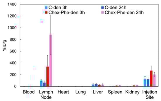 Chex-Phe-den showed the most efficient internalization into T cells and B cells, so the in vivo studies of Chex-Phe-den were carried out. Our previous work showed the biodistribution study of radiolabeled C-den after the intradermal injection at footpads in mice, indicating that C-den was efficiently accumulated in the popliteal lymph node [10]. In this study, radiolabeled Chex-Phe-den was injected using the same method, and the biodistribution study was performed. Figure 3 showed that Chex-Phe-den was highly accumulated in the lymph node, compared with C-den. The accumulation of Chex-Phe-den in the lymph node tended to increase after 24 h, but C-den tended to decrease. This suggests that the retention of these dendrimers in the lymph node was different. Our results indicate that the biodistribution was affected by the hydrophobicity of the dendrimer.