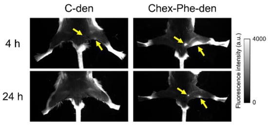 Green fluorescent dye-labeled C-den and Chex-Phe-den were intradermally injected into the right rear footpads of the mice, and fluorescence imaging of the lymph nodes was conducted after 4 h and 24 h. These dendrimers could visualize the popliteal and inguinal lymph nodes after 4 h, and the lymph nodes in the Chex-Phe-den-treated mice were brigher than in the C-den-den-treated mice. Chex-Phe-den visualized these two lymph nodes even after 24 h, but C-den did not (Figure 4). This indicates that Chex-Phe-den was highly accumulated in the lymph node and retained there, which is consistent with the biodistribution data (Figure 3).