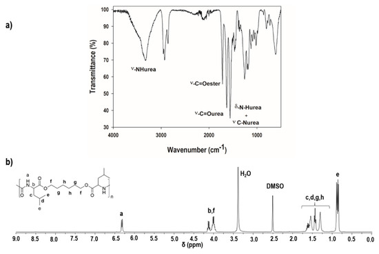 The chemical structure of the l-leucine-based PEU was studied by Fourier transform infrared (FTIR) and proton nuclear magnetic resonance (1H NMR) spectroscopies (Figure 2). In the FTIR spectrum, distinct bands corresponding to the ester and urea linkages were observed (Figure 2a). At 1726 cm−1, a band was detected ascribed to the stretching vibration of the –C=Oester. At ca. 3300 cm−1 and 1629 cm−1, it was also possible to isolate the bands corresponding to the stretching vibration of –NHurea and –C=Ourea, respectively. The band at ca. 1562 cm−1 was assigned to the bending vibration and stretching vibration of the –NHurea and C-Nurea. Further insights into the structure of the PEU were provided by 1H NMR analysis (Figure 2b). The resonance (a) at ca. 6.3 ppm corresponds to the protons of the –NH group of the urea linkage. The peaks observed between 3.9–4.25 ppm are ascribed to the protons–CH(C=O) (b) and –(C=O)OCH2– (f). The CH2 protons (c,g,h) and CH (d) protons resonate between 1.25–1.75 ppm. At ca. 0.8 ppm, the peak (e) can be identified, corresponding to the –CH3 protons. All the attributions are consistent with the anticipated chemical structure. Considering the results provided by the spectroscopic analysis, we concluded that the l-leucine-based PEU had been synthesised successfully.