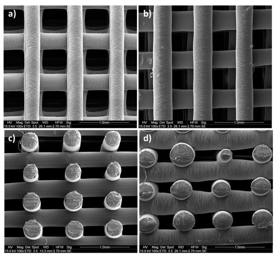 The interconnectivity and the distribution of pores together with pore geometry and size strongly influence cell distribution, proliferation and migration whilst shaping tissue ingrowth [7,36]. For this reason, the morphological features of PCL and PEU scaffolds were investigated by scanning electron microscopy (SEM) and micro computed tomography (Micro-CT). SEM micrographs demonstrated the successful printing of PCL and PEU scaffolds with well-defined square pore geometries and regular dimensions of approximately 500 µm × 500 µm (Figure 3). It is worth noting that the processing of PEU did not produce fibres as consistent in diameter as those produced for PCL. However, optimising process parameters still allowed for the extrusion of circular filaments with a fairly reproducible diameter (approx. 320 µm) and good adhesion between adjacent layers, thus ensuring the structural integrity of the constructs.