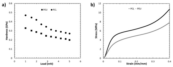 Mechanical data for 3D-bioprinted scaffolds of PEU and PCL (n = 5). (a) Nanoindentation data demonstrating the hardness of each scaffold as a function of the applied load, (b) compression data for each scaffold represented by stress–strain curves.