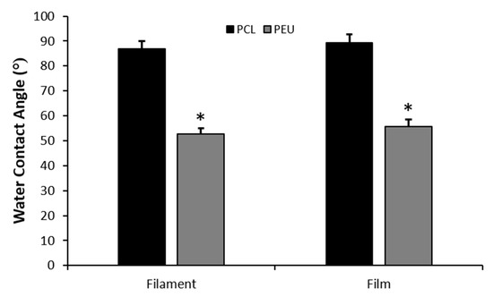 Average water contact angles for films and filaments of PCL and PEU scaffolds (* indicates p < 0.001, PEU vs. PCL; error bars represent standard error of mean, n = 5).