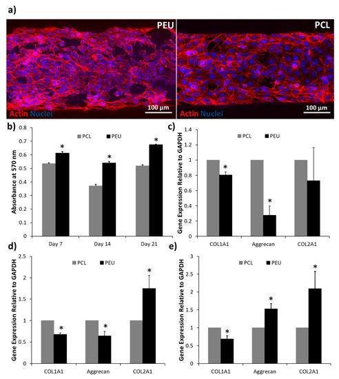 Single plain confocal microscopy images after phalloidin actin labelling indicated that both PEU and PCL scaffolds were supportive for TC28a2 human chondrocytes (Figure 6a). However, resazurin metabolism assays conducted at days 7, 14 and 21 revealed significant differences in cell viability between PEU and PCL constructs (Figure 6b). Chondrocytes cultured within PEU scaffolds absorbed significantly lighter at a wavelength of 570 nm. This is indicative of increased intracellular conversion of resazurin to resorufin via mitochondrial enzymes when cells were cultured within PEU scaffolds and, therefore, suggests the presence of a significantly higher number of viable cells [52]. In addition to this, chondrocytes cultured within PEU scaffolds exhibited differences in expression of chondrogenic markers when compared to cells culture in PCL scaffolds (Figure 6c–e). After 7 days of culture, chondrocytes exhibited significantly lower expression of genes associated with type I collagen and aggrecan synthesis, while levels of type II collagen were not significantly different (Figure 6c). At day 14 a similar trend was observed with the exception of type II collagen, which was expressed at significantly higher levels in the PEU scaffolds (Figure 6d). Finally, after 21 days in culture, a significantly higher expression of aggrecan and type II collagen was observed as well as a significantly lower expression of type I collagen (Figure 6e). At days 7 and 14 it can be argued that the differences between PEU and PCL are not distinct from a chondrogenic perspective. Type I collagen expression is significantly reduced in the PEU scaffolds within this timeframe and this is indicative of a more chondrogenic phenotype. However, at the same time points, aggrecan expression is significantly higher in PCL, which is also an indicator of a chondrogenic phenotype, while type II collagen expression does not show any differences until day 14. At day 21, however, a much more distinct, pro-chondrogenic effect is demonstrated in the PEU scaffolds, with lower type I collagen expression and higher expression of aggrecan and type II collagen. Combined, these data suggest a trend in gene expression that potentially demonstrates PEU better supports a more long-term chondrogenic phenotype in TC28a2 human chondrocytes than PCL [53,54]. This is likely due to chemical and mechanical differences between the two materials. Previous studies have demonstrated that hydrophilic surfaces enhance chondrogenic phenotypes by limiting protein adsorption and cell spreading, promoting a more spherical morphology [51,55,56]. Such a spherical phenotype is correlated with synthesis of a chondrogenic matrix [57,58,59]. Contact angle measurements revealed PEU to be significantly more hydrophilic than PCL and confocal microscopy images suggest that seeded cells exhibit reduced spreading on PEU scaffolds. Additionally, nanoindentation indicated that PEU was significantly softer than PCL, with hardness values of 0.33–0.20 GPa (versus 0.47–0.27 GPa) in the analysed load range (1–5 mN). This may also promote chondrogenesis, as prior studies have demonstrated that reduced matrix stiffness inhibits cell spreading and enhances expression of aggrecan and type II collagen [46,47].