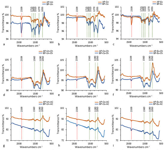In BP-Un and AP-Un (Figure 1a) the peaks at 1270 and 1055 cm−1 have about the same intensity, however, the lignin peaks, notably the peak at 1510 cm−1, are more intense in AP-Un (Figure 1a) than in BP-Un. The greater intensity of the lignin peaks confirms that AP-Un contains more lignin than BP-Un (Table 1).