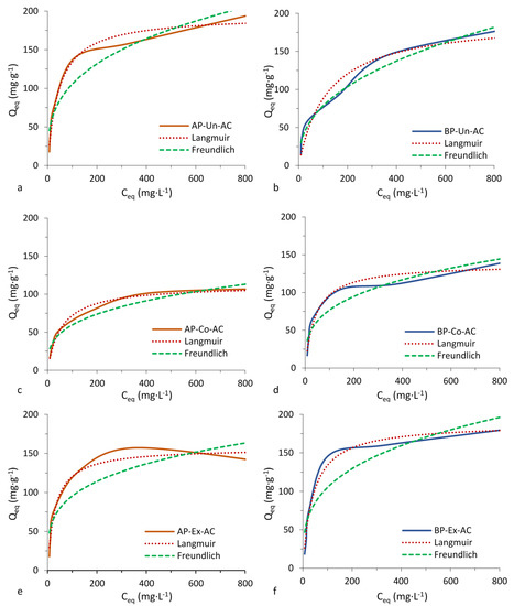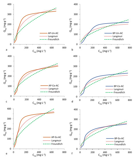Figure 2 and Figure 3 show the isotherms that can be classified as type I (Langmuir type). According to the International Union of Pure and Applied Chemistry (IUPAC) classification, the Langmuir type of isotherm indicates high affinity between adsorbate and adsorbent. The adsorption isotherm is an important tool that reveals the specific relationship between the adsorbate molecules and the carbonaceous adsorbents [31]. The Langmuir and Freundlich parameters, for methylene blue and phenol (Table 3) show that the piassava ACs adsorbed higher quantities of methylene blue than phenol and that there was an influence from the pretreatments in the adsorption processes of the two compounds. The Langmuir model assumes a monolayer coverage of dyes over a homogenous adsorbent surface without further adsorption occurring in the occupied sites. In comparison, a heterogeneous adsorption was described by the Freundlich isotherm. The Freundlich model showed a continued increase in the concentration of dye on the adsorbent surface [32] and did not assume homogenous site energies or limited adsorption.AP-AC have higher adsorption capacity for methylene blue than BP-AC. AC produced from extracted AP and BP (AP-Ex-AC and BP-Ex-AC) had higher adsorption capacity than other pretreatments tested. The Langmuir model showed a better fit to the isotherm data than the Freundlich model as indicated by the R2 (Qe vs. Ce) values. The better fit Langmuir model indicated that adsorption occurred on a homogeneous surface [33].