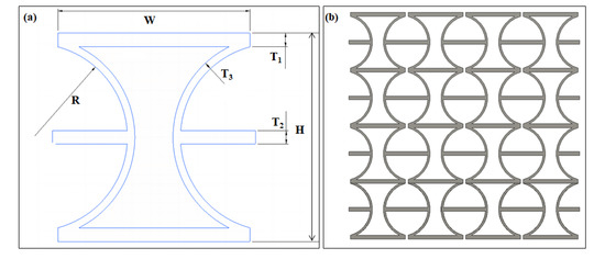 Figure 2 shows the geometry profiles of the CS-based unit and the 2D metamaterial structure. The width (W), height (H), and thickness of an individual unit are the main geometry parameters. (R) indicates the radius of the circular rings corresponding to the cylindrical shells between two horizontal beams. These two horizontal beams are always placed on both sides of the center of the circle symmetrically. With a fixed height (H) in each unit, variations in R values make the arc between horizontal beams different, further resulting in differing curvatures of cylindrical shells. R is one of the core parameters in the geometry design. It could bring various deformation capacities of units. In the following sections, the performances of models with different cylindrical shell angles will be compared. Another critical parameter in geometry design is the relative thickness of different parts in an individual unit. As shown in Figure 1a, two kinds of components were assembled in an individual unit, the horizontal straight beams as connections and cylindrical shells as the deformation elements. The thickness ratio of the horizontal beams to the cylindrical shells determines the deformation trend and influences the Poisson’s ratio. In the current design (Figure 2a), the straight beams (T1) located on the top and bottom were thicker than the middle connection beams(T2), and the thickness of the cylindrical shells (T3) was lower than both straight beams. As a result, significant deformation would happen in thinner cylindrical-shell-microstructures, while the thicker straight beam possesses a higher stiffness and keeps the required rigidity of the structure under sizeable uniaxial loadings.