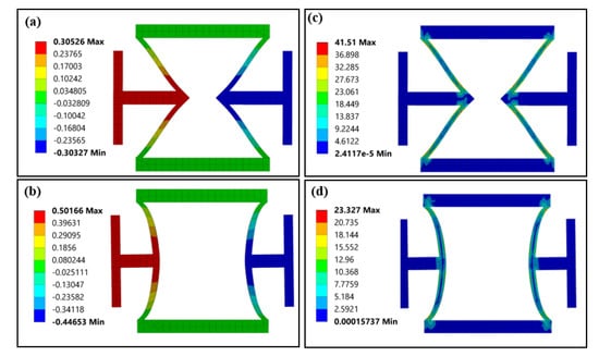 The FEA results of the re-entrant and CS-based units under uniaxial tension (strain 0.05): (a) transverse displacement (unit: mm) of the re-entrant unit, (b) transverse displacement (unit: mm) of the CS-based unit, (c) internal stress distribution (Von Mises equilibrium stress) of the re-entrant unit (unit: MPa) and (d) internal stress distribution (Von Mises equilibrium stress) of the CS-based units (unit: MPa).