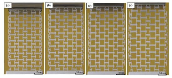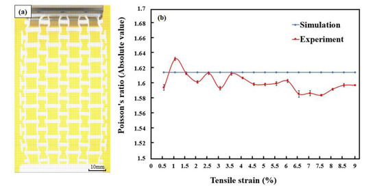 Figure 7 shows the recorded images of the 3D-printed specimen under uniaxial tensile loads. The specimen was deformed gradually up to the longitudinal strain of 0.05 and further to 0.09, and continued to expand transversely during the tension process. To calculate the Poisson’s ratio, the images were further processed using graphics software. Particularly, digital grid layers were added onto the original images (Figure 8a), and these layers would be used as references for the Poisson’s ratio calculation. Furthermore, according to the FEA simulation results, the distortions of units at the top and bottom layer lead to significant local effects. To improve the measurement accuracy, only the 4 × 8 unit array in the middle is used in calculating structural Poisson’s ratio.