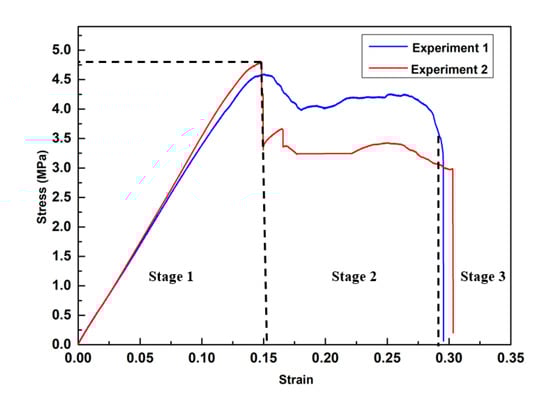 Figure 10 presents the stress–strain curve of CS-based metamaterial units. This curve follows three stages. In stage 1, the stress–strain curves showed an almost linear increment and reached their maximum stress value. In this stage, the elastic deformation of the internal structure was the principal deformation mode. A drop in stress occurred at the end of stage 1. In stage 2, the plastic deformation occurred and gradually replaced the elastic deformation as the main deformation mode. In this stage, specimens suffered internal structure damage due to the joint fracture and separation between the CS-beams and the thin connections. These damages originated from one unit, and developed to others. Therefore, it is reasonable to observe a sharp stress drop from 4.78 to 3.85 MPa in Experiment 2. When internal damage accumulated to a certain degree, the overall structure was destroyed, as shown in stage 3.