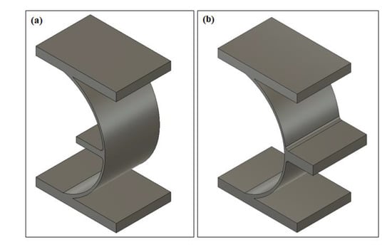The deformation mechanism of proposed CS-based NPR metamaterial can be explained using a fundamental element, as shown in Figure 11a. This element consists of horizontal beams and one 180° cylindrical shell. The horizontal beams can keep the whole structure connected, and the cylindrical shell carries the major deformation. Similarly, one can also develop another type of element (Figure 11b), which can deform oppositely. For simplicity, we named the former element as the negative element (NE) and the latter as the positive element (PE). Then new metamaterials with tailorable Poisson’s ratio could be designed by combining these two types of elements. For example, two NEs could form a negative Poisson’s ratio unit (Figure 1a), while two PEs could form a positive Poisson’s ratio unit. With the combination of one PE and one NE, a zero Poisson’s ratio unit would be created. The transverse deformations of these two elements are cancelled in an individual unit, leading to a constant transverse dimension and thus a zero Poisson’s ratio. These rules can also be applied to explain the deformation mechanisms of most existing paper-folding-inspired metamaterials [5,6,22,23,31,32,42,43,44,45,46].