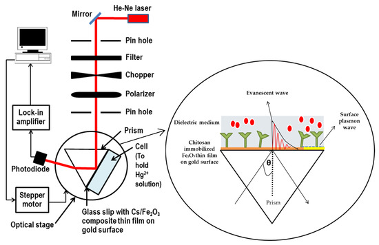 Fourier transform infrared (FTIR) spectra for each surface modification of thin films were recorded in the transmittance mode using a Perkin-Elmer spectrophotometer (Waltham, MA, USA) under the wavelength range 400–4000 cm−1. The absorbance spectra of the films were recorded from 200 to 500 nm using UV-Vis-NIR spectroscopy (UV-3600 Shimadzu, Kyoto, Japan). The optical band gap energy was calculated using the data obtained. Atomic force microscopy (AFM) analysis was carried out using Qscope 250, Qesant Instrument Corporation (Quesant, CA, USA) in intermittent mode to study the topography and height of Cs/Fe2O3 thin film. An optical-based sensing method based on surface plasmon resonance (SPR) was designed to identify the potential of the Cs/Fe2O3 thin film to detect Hg2+. Figure 1 shows the schematic diagram of the SPR instrument setup [58,59,60,61]. The SPR experiment was carried out by inserting Hg2+ solutions with different concentration varied from 0.01 to 0.5 ppm. It was injected one after another into the cell to bind with Cs/Fe2O3 thin film coated onto gold surface thin film. The SPR curve and resonance angle for all concentrations was monitored and recorded.