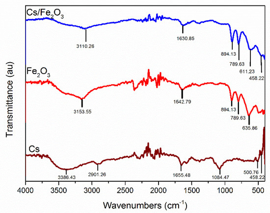 FTIR spectroscopy was used to identify the functional groups existed in Cs/Fe2O3 thin film. The spectrum of chitosan, Fe2O3 and Cs/Fe2O3 thin films in the range of 450–4000 cm−1 are represented in Figure 2. From the FTIR spectrum of chitosan thin film, the broad absorption band at 3386.43 cm−1 can be appointed to the stretching vibration of O–H. A weaker band found at 2901.26 cm−1 can be attributed to C–H stretching in chitosan. Another absorption band at 1655.48 cm−1 was associated with the presence of the C=O stretching bond. There is an absorption peak at 1084.47 cm−1 that corresponds to the C–O group, which indicates the presence of the –COOH group in chitosan thin film. Two more bands at 500.76 cm−1 and 458.22 cm−1 were assigned to the C–C bond and C–N bond respectively. This finding is well aligned to the previous study by Anas et al. [62].
