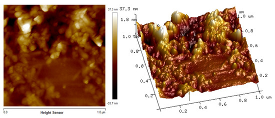 The in situ atomic force microscopy (AFM) measurements enable the chitosan, Fe2O3 and Cs/Fe2O3 adsorption on thin films to be visualized in real time. The AFM images illustrate the topographical in the thin films as shown in Figure 3, Figure 4 and Figure 5. The topographical can be observed by various parameters that exist to quantify the root mean square (rms) roughness of a surface. The RMS roughness value can be calculated from the cross-sectional profile or a surface area [66]. The RMS roughness obtained by chitosan, Fe2O3 and Cs/Fe2O3 thin film were 1.4 nm, 47 nm and 37.3 nm, respectively. The magnitude decreased in RMS roughness of Cs/Fe2O3 thin film compared to Fe2O3 thin film attributable to the association of two materials, which are chitosan and Fe2O3. The roughness implies that a smoothening mechanism by surface diffusion [67]. This result indicates that the presence of chitosan can enhance the surface of the thin film. The roughness introduced in the nanostructured maghemite in chitosan thin film intended appropriate form to enhance the thin film as sensing element [68]. This result is in line with the FTIR data, proving the presence of maghemite and chitosan in the Cs/Fe2O3 thin film based on the RMS roughness.