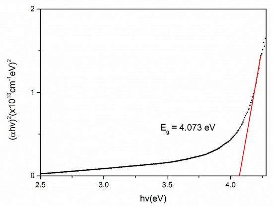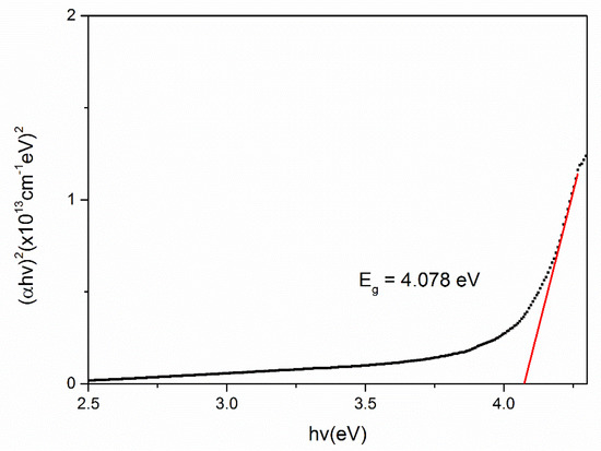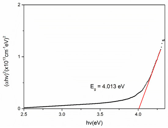 where hv is the photon energy, h is Plank’s constant, Eg is the optical band gap, k is constant and n is the transition states, i.e., direct or indirect transitions. Direct transition is transition in which a photon excites an electron from the valence band to the conduction band directly if the momentum of electrons and holes is the same in both bands (conduction and valence). On the other hand, indirect transition is a photon cannot be emitted because the electron must pass through an intermediate state and transfer momentum to the crystal lattice. From these, it can be concluded that the absorption in the thin films corresponds to a direct energy gap. For direct transition, n = 1/2 and this value is substituted in Equation (6) and becomes: