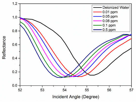 The optical sensing based on surface plasmon resonance (SPR) phenomenon was conducted by using Cs/Fe2O3 thin film to identify the SPR angle for deionized water as a control experiment. The SPR angle of 55.225° was further applied to compare the SPR angle for different concentration of Hg2+ solution ranged from 0.01 to 0.5 ppm. The SPR reflectively curves for Cs/Fe2O3 thin film in contact with the different concentration of Hg2+ are shown in Figure 10. It can be seen that the SPR curves of Hg2+ solution shifted from 0 to 0.5 ppm as compared with the deionized water SPR curve. The SPR angle for 0.01, 0.05, 0.08, 0.1 and 0.5 ppm of Hg2+ were 54.615°, 54.398°, 54.212°, 54.027° and 53.836°, respectively, with the corresponding error of ±0.001° (the resolution of the stepping motor of the SPR). Overall, it was observed that the SPR shifted to the left with increasing concentration of Hg2+ solution. This finding can be attributed to the increase in binding between analyte–ligand, which resulted in the change of refractive index as well as the thickness of the Cs/Fe2O3 sensing layer [76,77,78,79]. Hence it is confirmed that Cs/Fe2O3 thin film has an affinity with Hg2+ and can be integrated with SPR optical-based sensing method for detection of Hg2+.