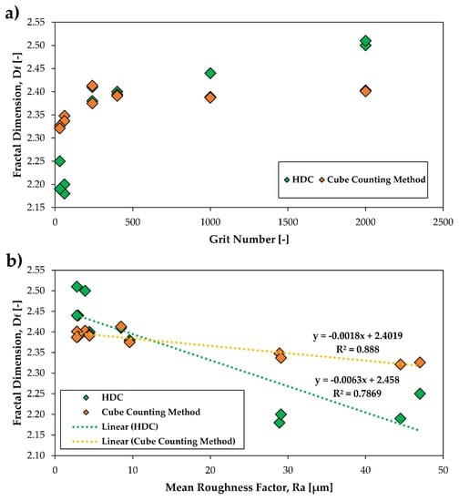 3.4. The Relationship between the Fractal Dimension Df and the Grit Number as Well as the Mean Roughness Ra