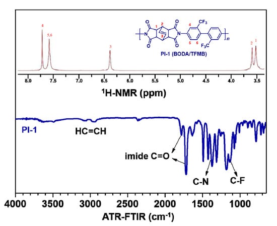Attenuated total reflectance Fourier transform infrared spectroscopy (ATR-FTIR) and 1H-nuclear magnetic resonance (1H NMR) spectra of representative PI-1 film.