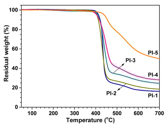 Thermogravimetric analysis (TGA) curves of semi-alicyclic polyimide films in nitrogen.