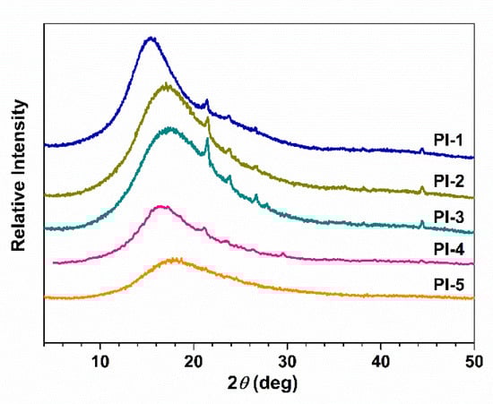 The Mn and Mw of these PIs were in the range of 5.08–6.91 × 104 g/mol and 7.54–9.23 × 104 g/mol, respectively. All the semi-alicyclic PIs showed high molecular weight and narrow molecular weight distribution (Mw/Mn) below 1.50, which can reach the molecular weight level of fully-aromatic PIs and is better than most semi-alicyclic systems reported in the literatures [22,35]. This ensured their thermal and mechanical properties of corresponding films. In addition, it is also noted thatsemi-alicyclic PIs have excellent solubility, which can be dissolved in the strong and even weak polar solvents including NMP, N,N-dimethylformamide (DMF), N,N-dimethylacetamide (DMAc), tetrahydrofuran (THF) and dioxane. The improved solubility of these PIs is thought to be the presence of alicyclic structures and relatively high fluorine content derived from the trifluoromethyl groups in diamine moiety. In addition, semi-alicyclic PI-5 derived from CBDA and 6FBAS showed much better solubility than CBDA-based PI with TFMB reported in the literature [28]. This is mainly because the incorporation of ether linkages and sulfonyl groups in diamine moiety. Thus, these soluble semi-alicyclic PIs can be easily processed by common organic solvents, which is very convenient for a variety of applications.