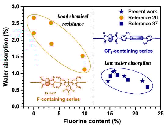 The correlation between fluorine content and water absorption of semi-alicyclic polyimides and comparison with other semi-alicyclic systems reported in the previous work [26,37].