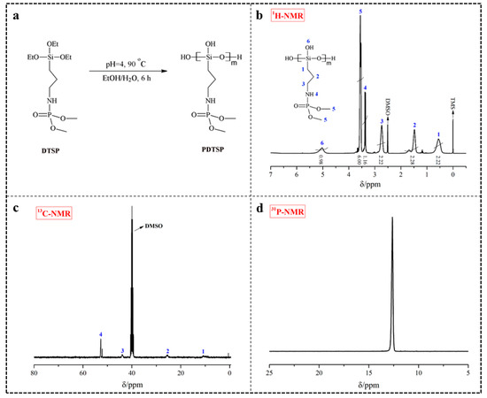 The siloxane polymer PDTSP was prepared through the sol-gel method and the synthesis scheme was shown in Figure 1a. During this reaction, the siloxane bond (Si–OCH2CH3) in DTSP was firstly hydrolyzed to silanol bond (Si–OH), and then copolymerized themselves to form siloxane polymer, which can be reacted with the hydroxyl group (–OH) and bound onto cellulose. The chemical structure of PDTSP was confirmed by 1H-NMR, 13C-NMR, and 31P-NMR, presented in Figure 1.