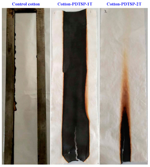 Vertical flammability test (VFT) and LOI was used to evaluate the combustion properties of cotton fabrics coated with PDTSP, and the photos taken after VFT and corresponding data summarized were given in Figure 3 and Table 2. It can be seen that control cotton samples burned completely, and no residue remained. After coating with PDTSP, the fabrics could leave considerable residue char and showed no afterglow time. Moreover, the afterflame time and char length decreased with the increase of treating times. Compared with the 5.1s of afterflame time for Cotton-PDTSP-1T, no afterflame time could be observed in the samples of Cotton-PDTSP-2T. Although Cotton-PDTSP-1T cannot pass the vertical flammability test and LOI was 24.1%, the char-forming properties were greatly improved. When the cotton fabrics were treated two times with PDTSP coating, the coated cotton samples presented a char length of 9.8 cm and LOI increased to 27.1%, which meant that Cotton-PDTSP-2T had good flame-retardant behavior and could pass the vertical flammability test.