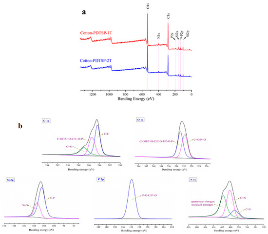 XPS spectra of char residue of PDTSP coated cotton (a); High-resolution C 1s, O 1s, Si 2p, P 2p, and N 1s spectra for the char residue of Cotton-PDTSP-2T (b).