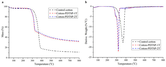 The thermal stability of control cotton and PDTSP coated cotton fabrics was evaluated by TG and DTG in the N2 atmosphere, and the results were presented in Figure 6. As shown in Figure 6a,b, both Cotton-PDTSP-1T and Cotton-PDTSP-2T began to degrade at 279 °C (T5%, the temperature at 5 wt % weight loss) and the maximum rate degradation temperature (Tmax) appeared at 319 °C. These temperatures were lower than control fabrics and might be due to the dehydration of cellulose catalyzed by phosphorus/polyphosphoric acid generated from PDTSP during thermal degradation [31,32]. However, over 60% and 30% of char residue at Tmax and 800 °C could remain for Cotton-PDTSP-1T and Cotton-PDTSP-2T, and they were much higher than control cotton (43% and 11%), which indicated that PDTSP could greatly improve the thermal stability and char-forming properties of cotton fabrics.