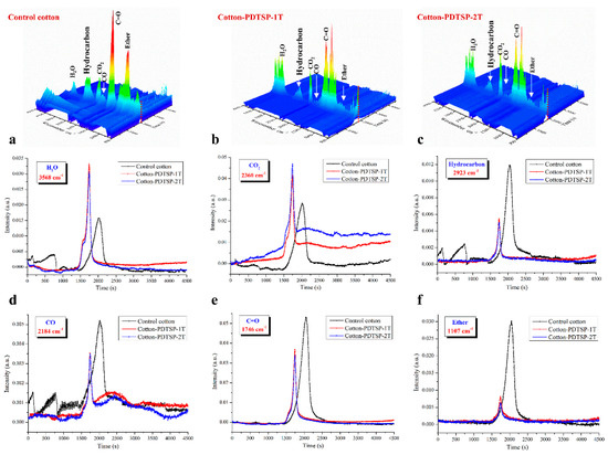 TG-IR measurement was used to study the volatile pyrolysis products of control cotton and PDTSP-coated cotton fabrics during thermal decomposition. Cotton fabrics before and after coating decomposed to some characteristic products during heating, and 3D diagrams of gaseous volatiles during the pyrolysis process were given in Figure 7. The highest intensity of volatiles for Cotton-PDTSP-1T and Cotton-PDTSP-2T appeared earlier than control cotton, which might be related to the lower Tmax and by TG results. For control cotton, the typical pyrolysis products were H2O (3568 cm−1), CO2 (2360 cm−1), hydrocarbon (2923 cm−1), CO (2184 cm−1), C=O compounds (1746 cm−1) and ether (1107 cm−1) [21,33,34]. Moreover, the same products can be observed in the PDTSP-coated cotton fabrics, which means that PDTSP coating would not change the pyrolysis products and thermal-degradation process.