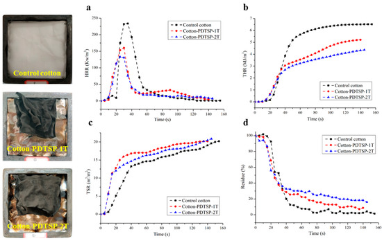 HRR and THR curves of samples were presented in Figure 8a,b. The values of PHRR (peak of the heat release rate) and THR were reduced after coating with PDTSP. Compared with control samples (PHRR, 233.80 kW/m2), Cotton-PDTSP-1T and Cotton-PDTSP-2T showed lower PHRR values at 160.09 and 132.89 kW/m2. Correspondingly, THR values decreased from 6.51 MJ/m2 to 5.21 and 4.36 MJ/m2. The reduction of PHRR and THR values indicated that PDTSP-coating can greatly hinder heat release and enhance the flame retardancy of cotton fabrics. It can be explained that PDTSP can promote the formation of the char layer and prevent further combustion by isolating heat and oxygen, which can be supported by char residue in Figure 8d. With the increase of PDTSP deposition, the char-forming properties were greatly improved. Compared with control samples (1.43%), higher residues were achieved for PDTSP-1T and Cotton-PDTSP-2T at 8.76% and 16.09%, respectively.