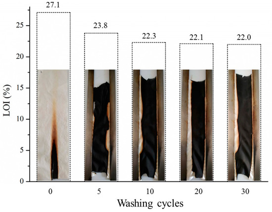 To measure the washing stability of Cotton-PDTSP-2T, VFT, and LOI values were detected and the results were presented in Figure 9. After five washing cycles, the LOI value decreased from 27.1% to 23.8%, which might be due to the removal of unbound PDTSP from the surface of cotton fibers and hydrolysis of Si–O–C bond between siloxane groups and cellulose [22]. With a further increase of washing cycles, the LOI values had a slight decrease and 22.0% of LOI value could be maintained after 30 washing cycles, which is higher than control cotton. From the VFT pictures, although the samples cannot pass the vertical flammability test after washing, they still had good char-forming properties and no afterglow phenomena could be observed during the test. To improve the washing durability, designing functional copolymers prepared by phosphoramidate monomer and siloxane monomer with multi-reactive groups might be an efficient way, which will be further studied in our following research.